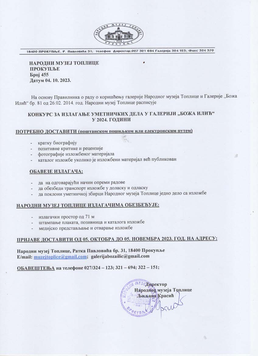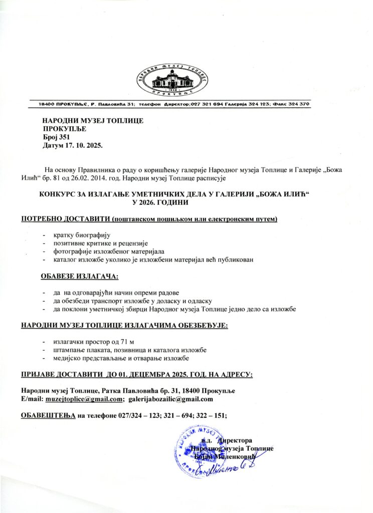 Конкурс за излагање уметничких дела у галерији Божа Илић